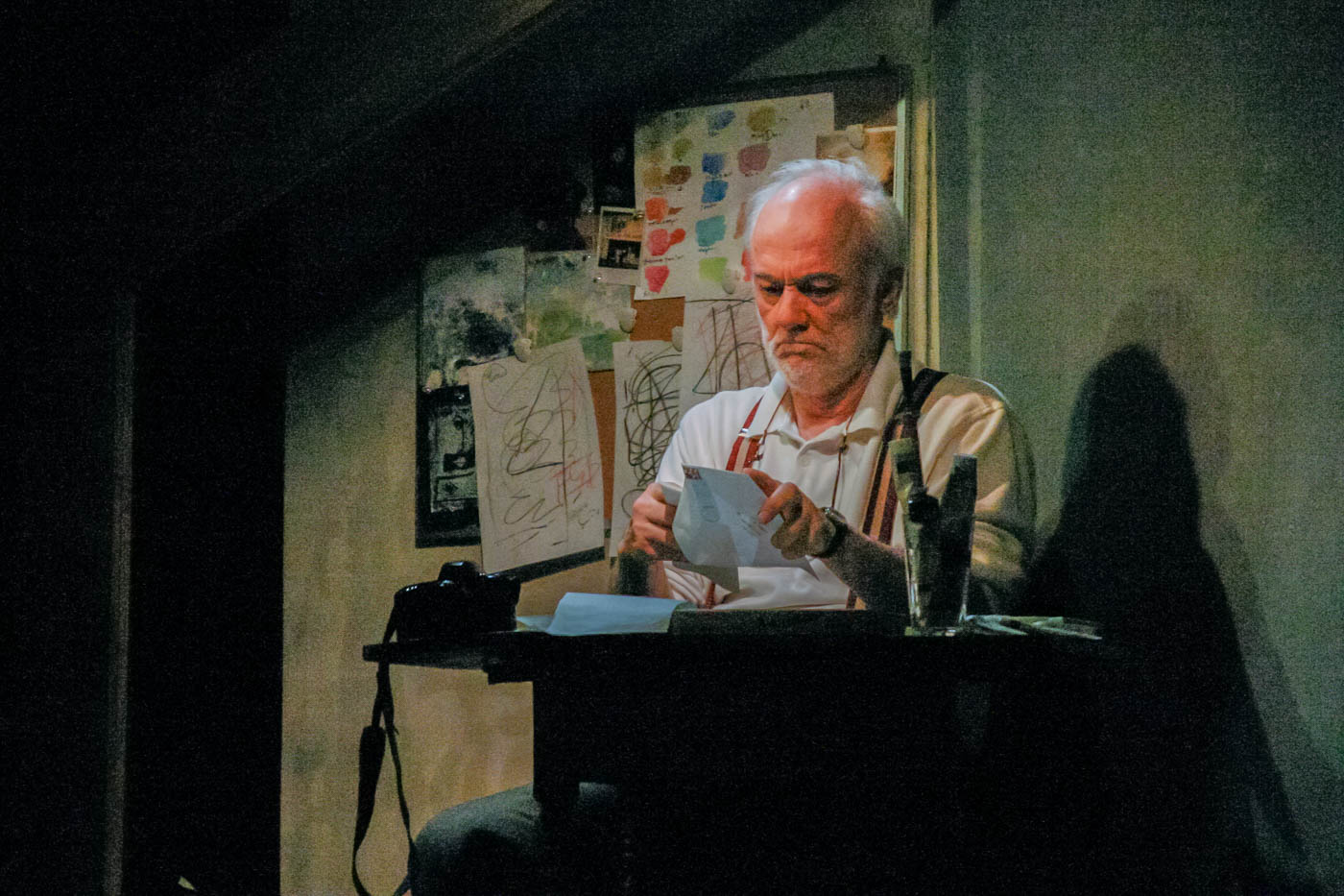 An abstract set uses projections and lighting to create a multi-layered mixture of reality and memory.
